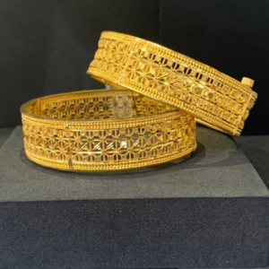 These exquisite gold bangles feature a detailed filigree design, showcasing a perfect blend of traditional craftsmanship and...